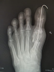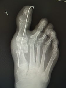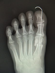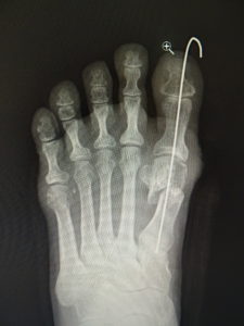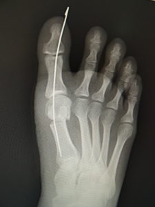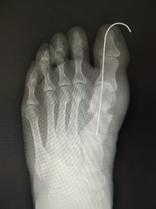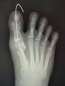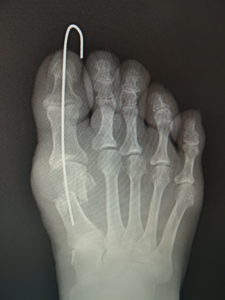 最近では、原則として固定ワイヤーは経皮的の一本のみとし、ワイヤーの先端は皮膚の外に出ているので、抜く時(術後3週間目)の患者さんの負担はほぼありません。こうすることによるデメリットはなく、むしろ術後成績は良くなっています。