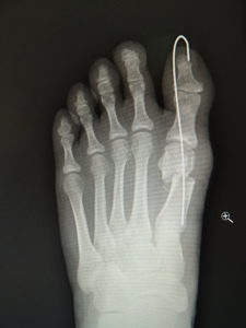 私は、ミッチェル変法ないしハモンド変法を行います(図6,7)。前日入院、腰椎麻酔(当日のみ臥床となります。)で一時間ほどの手術です。中足骨で骨切りを行い、長さも調節(多くはエジプト型足なので幾分短縮します。)しながら向きを矯正し、骨切り部をワイヤーで固定します。母趾内転筋の切離や、母趾外転筋の移行を検討します。中足骨頭部の種子骨を、正しい位置に戻して縫合します。術後は念のため、3週間ほど短いソックス型のギプスを装着しますが、術翌日から歩行訓練などの理学療法を行います。1ヵ月半ほどで骨癒合します。骨癒合が得られなかった症例はありません。2~3か月で普通に靴が履けます。入院期間は相談して決めればよいのですが、最短なら抜糸まで10日間、或いはギプス固定期間の3週間などが目安となります。
